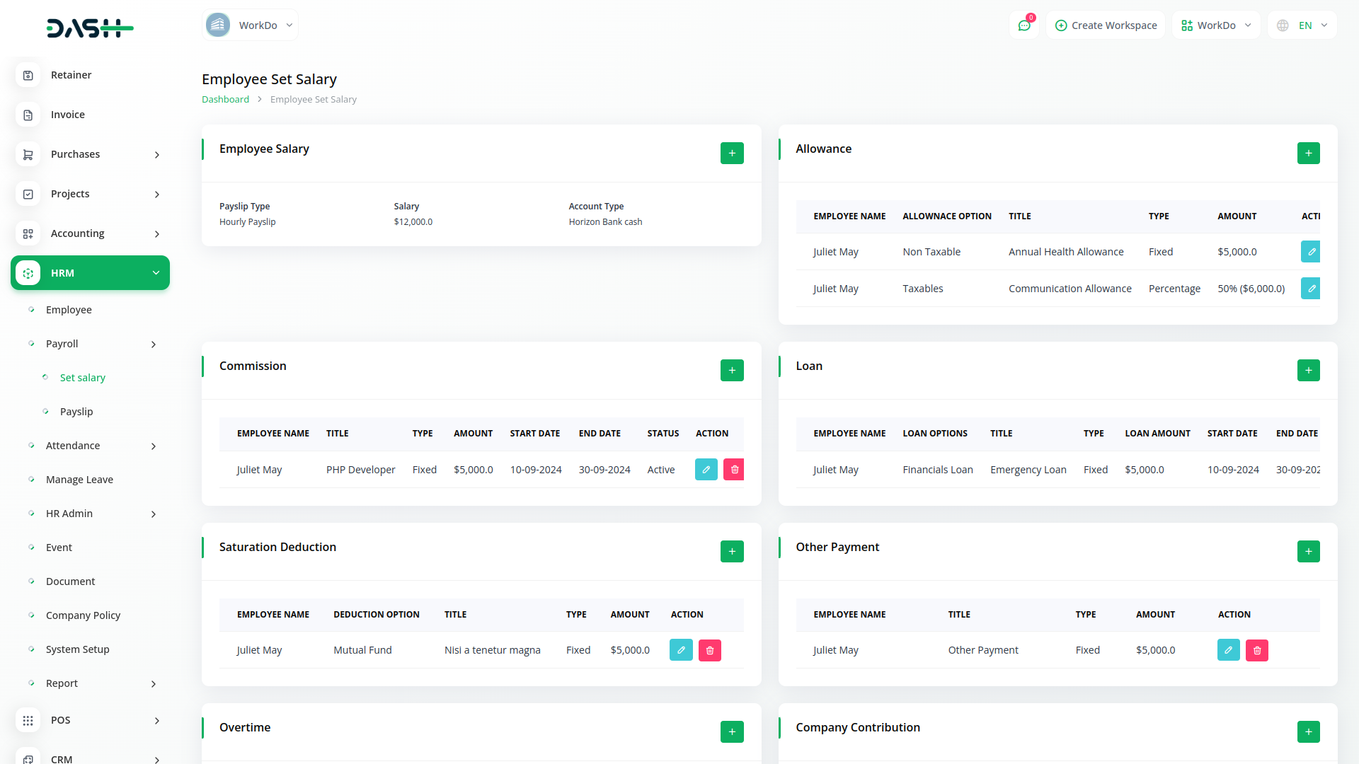 Manage payroll in just a few clicks. Calculate salaries, schedule deposits, and make sure your employees get paid on time. Keep data of all workforce costs, transfers, deposits, and other employee-related transactions for future reference.